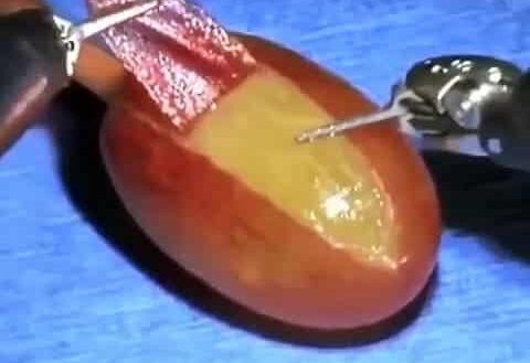 On parle de technicité pour les chirurgien qui peuvent intervenir pour couper et recoudre dans nos corps. Ce chirurgien montre sa précision avec ses outils en s’exerçant sur un fruit, en lui ôtant la peau, puis en lui remettant, avec des fils de suture !