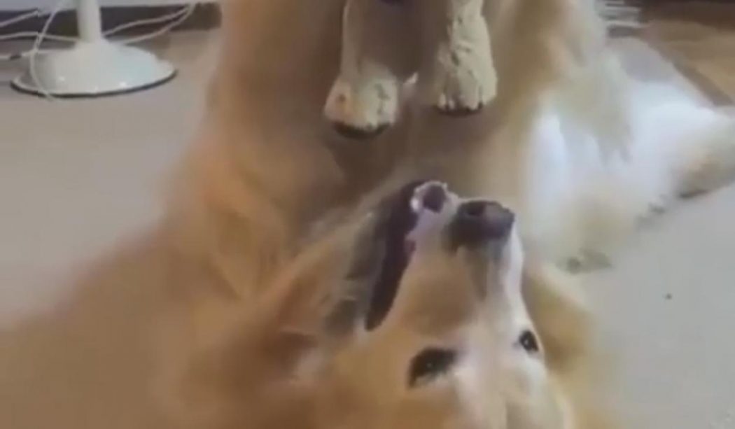 On peut voir le Golden Retriever tenir son jouet en l’air, puis rouler avec lui gaiement sur le tapis.