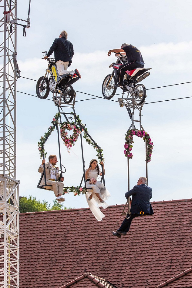 Selon la presse locale, Anna, qui appartient à la famille des artistes Traber, a épousé Sven Lier à l’occasion de cette cérémonie unique. Le père de la mariée, Johann Traber, a conduit le couple avec une moto sur la corde.