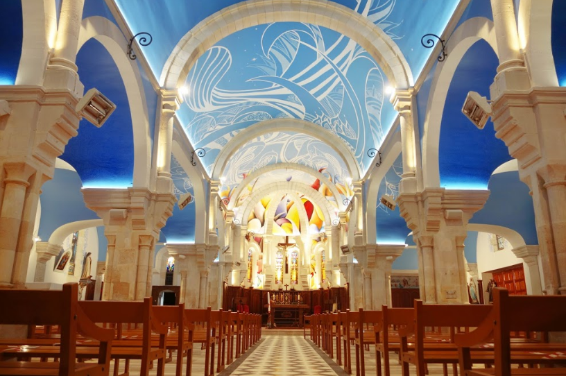 Il a su marier tous les éléments identitaires de l’église qui se démarque par sa singularité, sa spiritualité et ses couleurs qui s’identifient à la station balnéaire qu’est Châtelaillon-Plage. En effet, la première impression en découvrant l’intérieur est son air contemporain et le dynamisme qui s’y dégage. Les couleurs chaudes se répandent le long de la voûte vers le chœur. Les formes semblent emmenées dans un voyage aquatique, pour rappeler la mer.