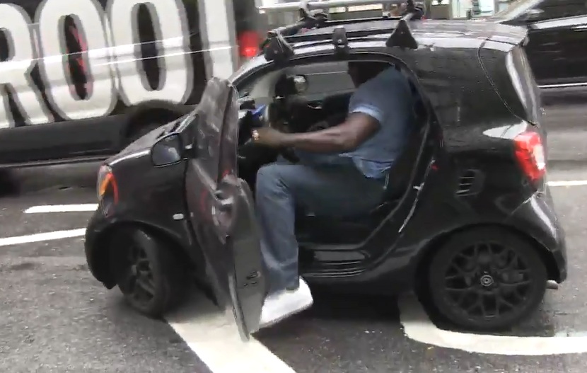 Au lieu de cela, Shaq ouvrit la porte d’un Smart et se fourra dans le siège du conducteur. Il réussit d’une manière ou d’une autre à mettre ses deux pieds massifs en position de conduite.