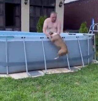 Un homme a du mal à dire à son chien de ne pas sauter dans la piscine. Le bouledog fait tout pour aller dans la piscine hors sol et son propriétaire a un mal… de chien à le faire sortir.