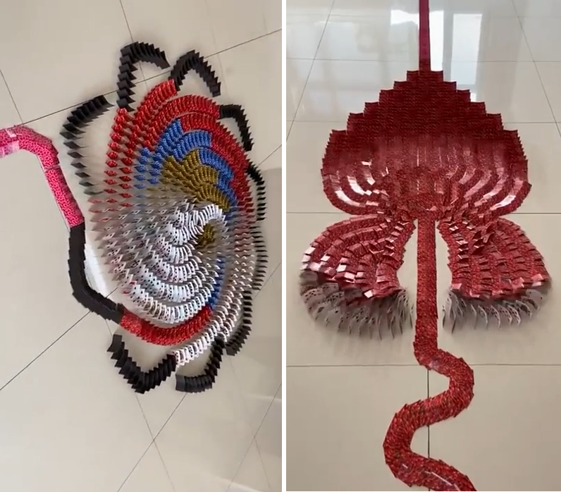 Toutefois, certaines personnes ont poussé le concept un peu plus loin en utilisant différentes couleurs, tout en formant des figures différentes. Le résultat est époustouflant si vous rajoutez une dose de créativité. Cette vidéo vous dévoile un parcours qui ressemble plus à un spectacle, où les dominos semblent faire un ballet remplit de grace.