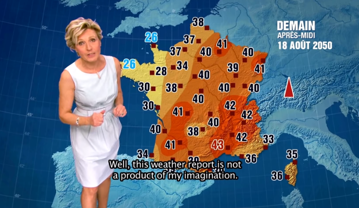 En 2014, la présentatrice de la météo de TF1 Évelyne Dhéliat s’est lancée dans une campagne de sensibilisation sur le réchauffement climatique. La chaîne a proposé alors un faux bulletin météorologique pour le 17 août 2050. Sur la carte, elle commentait des températures très élevées. Celle-ci montrait une chaleur étouffante : 43 °C à Nîmes, 42 °C à Lyon, 40 °C à Bordeaux, 38 °C à Lille, 36 °C à Marseille. La France aurait eu droit à une canicule ce jour-là. Toutefois, il n’a pas fallu attendre 2050 pour que cette situation se produise.