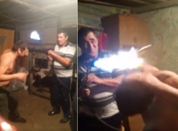 La vidéo montre un gars qui se fait bruler les cheveux par une flamme sortant d’un tuyau de gaz tenu par un autre homme. A chaque fois que les cheveux partent en fumée, il essaye d’atténuer puis reprend l’opération.