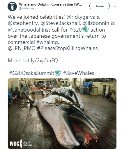 Des groupes de défense de la nature et des célébrités, y compris Stephen Fry et Ricky Gervais, ont exhorté les dirigeants du G20 à organiser une « intervention » lors du sommet et à condamner publiquement la chasse à la baleine dans une lettre partagée par le groupe The Link Whales vendredi.