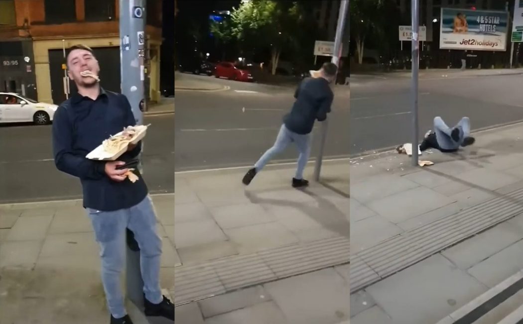 Tout comme cet homme qui a clairement trop bu et qu’il ne peut plus rester debout. Il avait un plat dans ses mains à manger et il n’a pas réussi à le garder. Il a perdu l’équilibre et est brutalement tombé par terre !