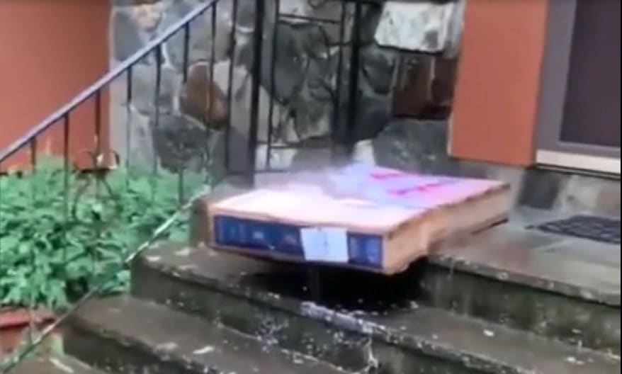 En rentrant chez lui, l’homme retrouve son colis tout trempé, ce qui est quand même très dommage !
