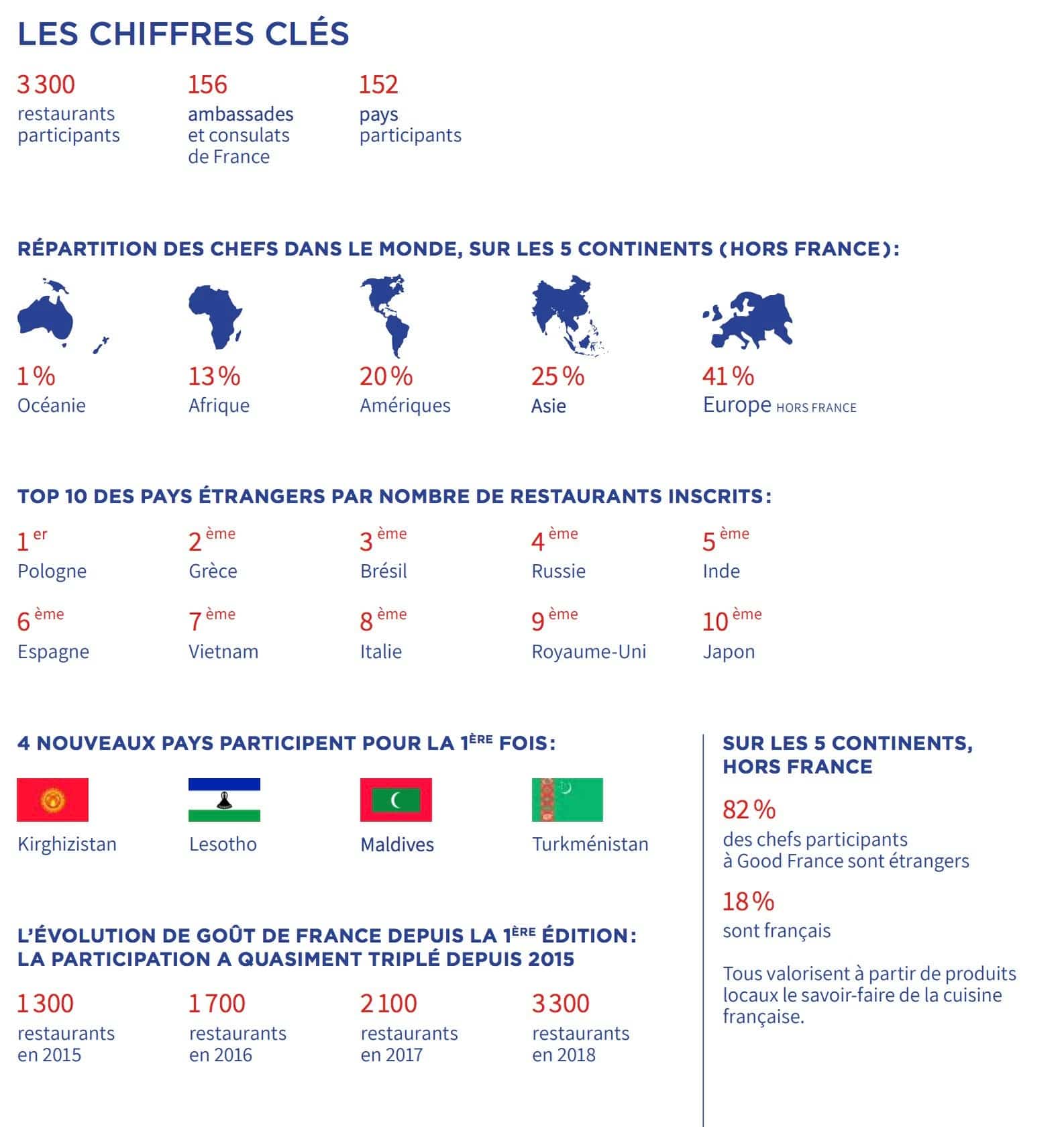 Pour trouver les restaurants participants dans votre ville, vous pouvez consulter le site www.goodfrance.com. Les plus grands nombres d’établissements inscrits se trouvent en Pologne, en Grèce et au Brésil, et quatre nouveaux pays y prennent part pour la première fois cette année : le Kirghizistan, le Lesotho, les Maldives et le Turkménistan.