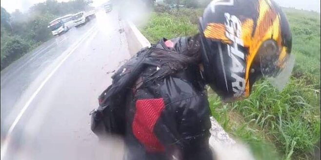 Un motard sauve sa copine lors d’un crash sur route mouillée.