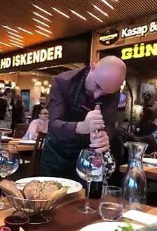L’ouverture du vin, c’est un rituel pour ce serveur, par contre, le client doit patienter deux heures avant de pouvoir boire une gorgée…