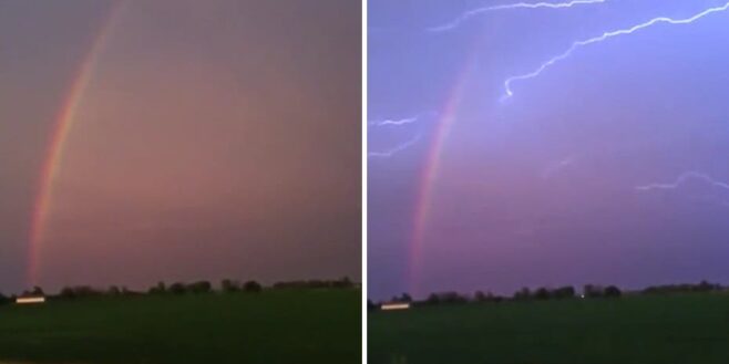 En même temps, des étincelles géantes illuminent le ciel. Le mélange devient effrayant, mais impressionnant. Cela ne se produit que rarement même dans les régions où les orages sont fréquents. L’ensemble ressemble à un joli tableau rempli de drame mais aussi de douceur grâce aux belles couleurs de l’arc-en-ciel.