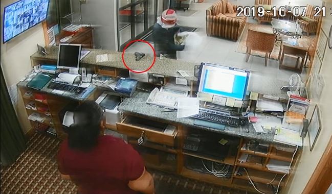 Une scène de vol a été enregistrée par la caméra de surveillance d’un hôtel de Paducah, dans le Kentucky. La vidéo montre un homme masqué – identifié plus tard sous le nom de Cory Phillips – entre dans l’hôtel et demande de l’argent à la femme derrière le comptoir, la menaçant d’une arme à feu. Elle jette de l’argent sur le comptoir et le voleur pose son arme pour récupérer le butin. Saisissant l’occasion, l’employé prend le pistolet et le pointe vers le voleur, qui s’enfuit immédiatement.