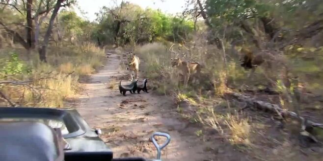 Cela a été filmé dans la réserve Thornybush Nature en Afrique du Sud. Les blaireaux sont absolument courageux et voulaient le rappeler à ces lions.