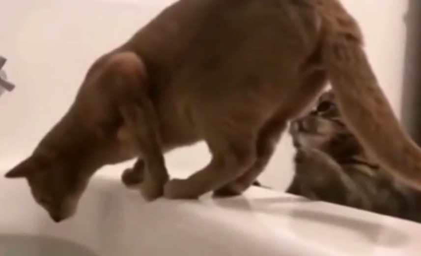 Ce chat subit la plus terrible des trahisons de son ami. Alors qu’il se trouvait sur les bords d’une baignoire, regardant l’eau, son ami l’a poussé tout doucement de derrière. Il est ainsi tombé directement dans l’eau. Une fois sorti du bain, il s’est précipité à rattraper son ami.