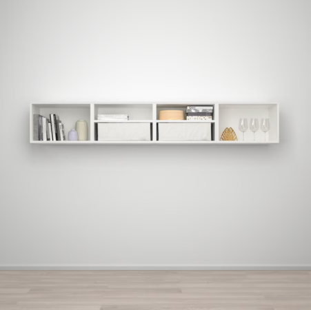 Cette étagère murale de 240 x 42 x 40 cm est pour sa part simplissime à mettre en place. Elle comporte quatre niches que vous pouvez cacher ou non avec des portes.