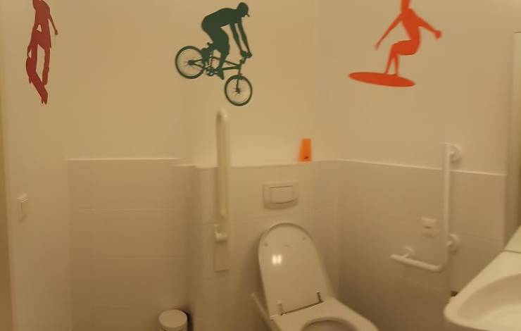 Drôle de façon de décorer les toilettes pour des handicapés. Les ornements muraux ont de quoi leurs saper le moral.
