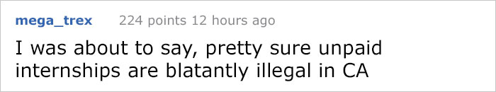 J’étais sur le point de dire que les stages non remunérés sont carrément illégaux en Californie.