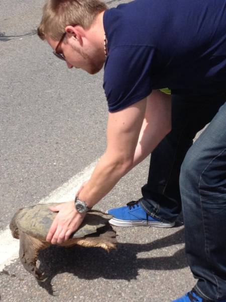 Sans ce Finlandais, cette tortue serait déjà écrasée par une voiture. Il a eu la bonne volonté de l’enlever de l’autoroute pour le mettre sur la bonne voie.