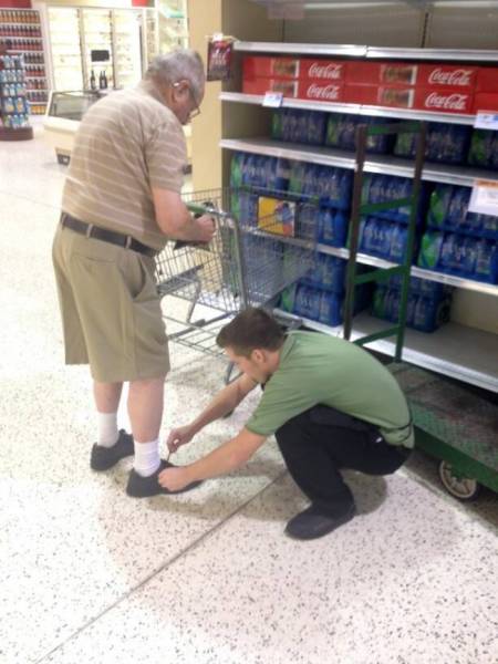 En remarquant le lacet des chaussures dénoué de ce vieil homme, Gage, cet employé de Publix s’est mis à genoux pour l’attacher. Il l’a fait de bon cœur car il savait que le monsieur ne pouvait pas le faire.
