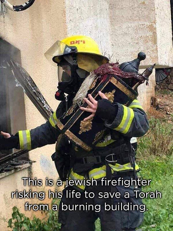 Sur la photo, un pompier juif qui a risqué sa vie pour récupérer une Torah dans l’immeuble qui est en feu.