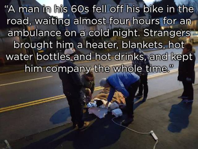 Cet homme âgé de 60 ans environ est tombé de son vélo pendant une nuit d’hiver. Les gens du quartier lui ont donné de la couverture, de l’eau et boisson chaude et lui ont tenu compagnie le temps que l’ambulance arrive.