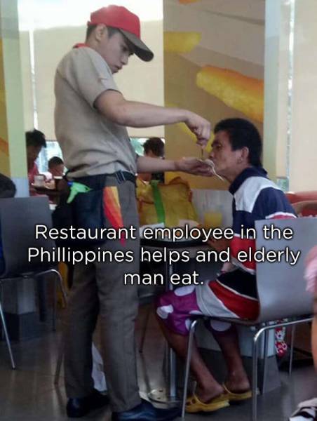 Dans ce restaurant, les personnels aident les personnes âgées à manger.