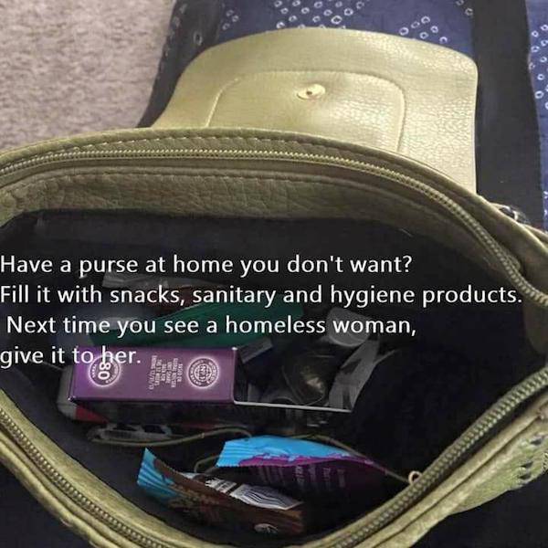 Si vous avez chez vous un sac qui ne vous serve plus, remplissez-le de nourriture ainsi que des produits sanitaires. Offrez-le ensuite à un sans-abri.