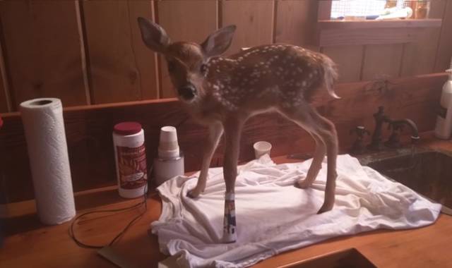 Deux faons étaient nés dans la cour du monsieur. Mais l’un d’eux avait la jambe cassée. L’homme le ramena alors chez lui pour le soigner le temps qu’il se remette en état. Une fois la jambe guérie, le faon était relâché pour rejoindre sa famille.