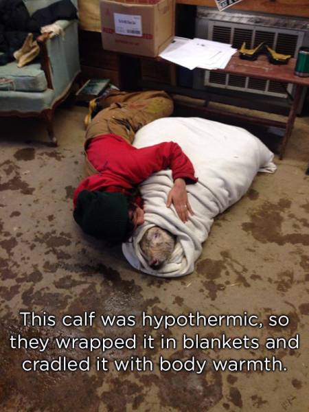 Ce veau souffrait d’une hypothermie, son maître l’a enveloppé de couvertures tout en le berçant.