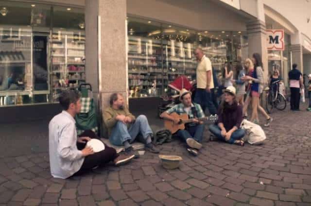 Ces trois personnes en plein spectacle sur la photo sont des étudiants allemands. Afin de venir en aide à ce sans abri, ils ont décidé de réaliser le spectacle dans le but de récolter de l’argent.