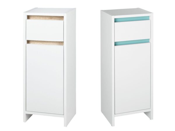 Fabriqué en aggloméré mélaminé, ce meuble de salle de bain est résistant à l’eau, la chaleur et l’humidité. Doté d’une porte placard et d’un tiroir profond, ce modèle vendu chez le discounter se décline en deux couleurs au choix (bleu et bois naturel).