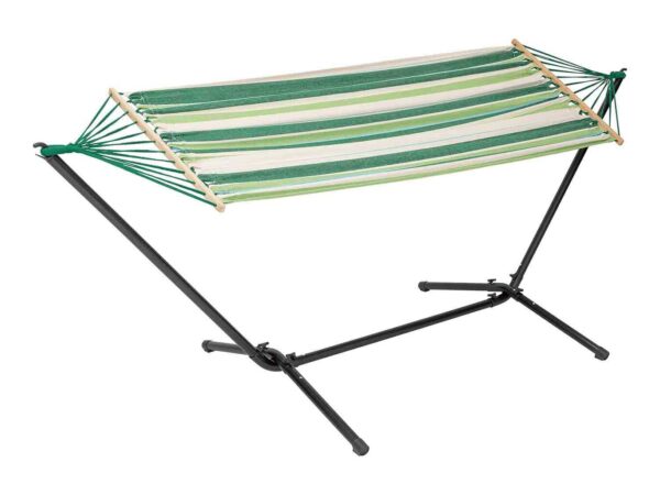 Composé d’un cadre solide fait de tubes en acier robustes et durables, ce hamac ne nécessite pas le besoin d’être attaché. Vous pouvez donc le poser n’importe où afin de profiter de celui-ci !