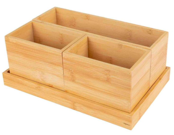 C’est un ensemble qui comprend trois boîtes rectangulaires de différentes tailles et un plateau qui sert de support. Toutes les pièces ont été réalisées en bois de bambou. Cela leur donne ainsi un toucher lisse.
