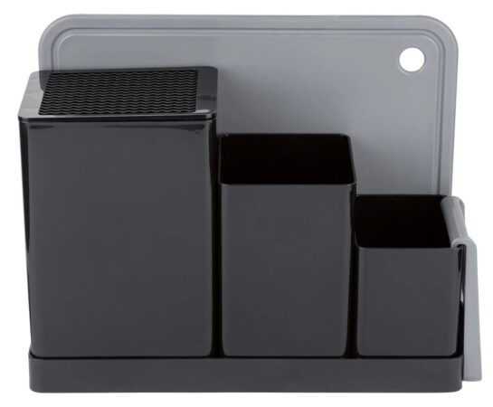 Tous les éléments sont en plastique et restent disponibles en noir/gris. L’accessoire comprend un porte-couteau d’une capacité de six unités, un porte-ustensile, un porte-accessoires pouvant supporter 3 à 6 petites pièces.