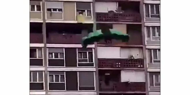 Filmé depuis le parking, cet individu a fait un saut incroyable en parapente depuis le 12ème étage d’un immeuble. Cette scène a ensuite fait le tour de la toile.
