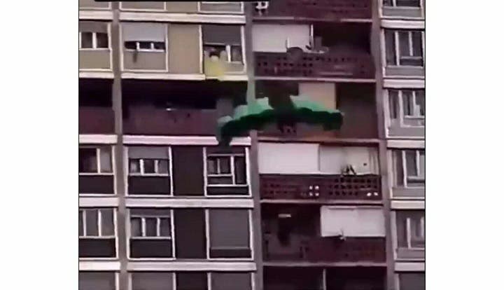 Filmé depuis le parking, cet individu a fait un saut incroyable en parapente depuis le 12ème étage d’un immeuble. Cette scène a ensuite fait le tour de la toile.