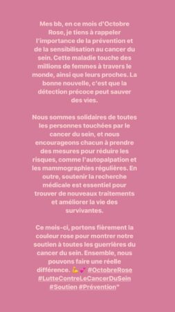 Elle écrit ainsi dans son long message : « Mes bébés, en ce mois d’Octobre Rose, je tiens à rappeler l’importance de la prévention. Et de la sensibilisation au cancer du sein. ». Mais alors la question se pose, qu’est-ce que ce fameux Octobre Rose ? Il s’agit d’une campagne de prévention. Celle-ci a pour but d’inciter les femmes à aller se faire dépister.