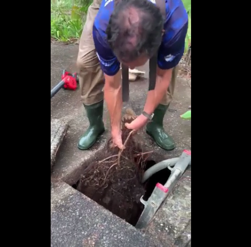 En nettoyant un réservoir d’eau de pluie, cet homme retire des racines d’arbres d’une quantité et d’une longueur incroyable, qu’on croirait voir un monstre poilu.
