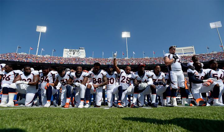 Une photo très touchante : l’équipe de Denver Broncos se met tous à genoux pour chanter l’hymne national avant le match.