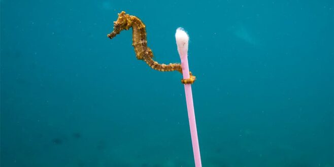 Voici une photo reflétant la pollution des eaux marine en Indonésie. Cet hippocampe emporte un coton-tige.