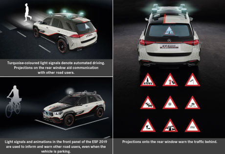 Comme son nom l’indique, Experimental-Sicherheits-Fahrzeug ou Experimental Safety Vehicle en anglais (ESF 2019) est le nouveau prototype de Mercedes qui intègre de nombreuses innovations en termes de sécurité. En tant que véhicule autonome, il est équipé d’écrans extérieurs se trouvant à la calandre et au pare-brise, qui servent à renseigner les autres usagers de la route. Il est doté aussi des airsbags partout : sur les côtés, mais surtout à l’arrière, dans le dossier des sièges avant.