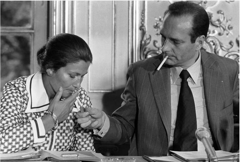 Il allume la cigarette de Simone Vei, Ministre de la santé