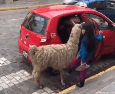 Exemple avec cette dame en taxi à Cusco qui fait monter son animal dans la voiture, et cela ne gène pas le conducteur.