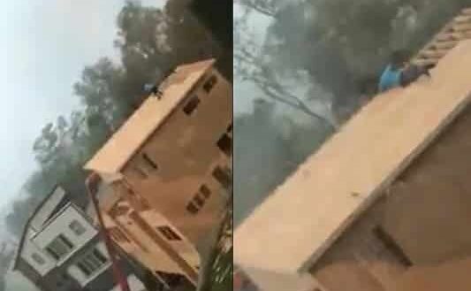 Alors qu’une grosse tempête se préparait, des ouvriers étaient sur le toit d’une maison de trois étages pour finir de réparer le toit. Soudain, la grosse tempête arrive et les ouvriers se trouvent coincés.