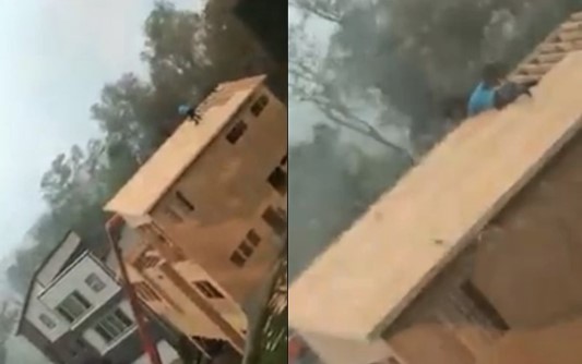 Alors qu’une grosse tempête se préparait, des ouvriers étaient sur le toit d’une maison de trois étages pour finir de réparer le toit. Soudain, la grosse tempête arrive et les ouvriers se trouvent coincés.