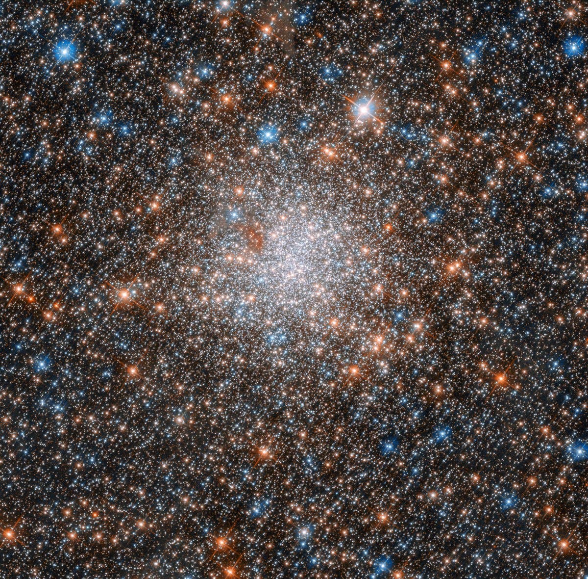 Cette boule d’étoiles scintillante est l’amas globulaire NGC 1898, qui se situe vers le centre du Grand Nuage Magellan, l’un de nos plus proches voisins cosmiques. Le Grand nuage magellanique est une galaxie naine qui héberge une population extrêmement riche d’amas d’étoiles, ce qui en fait un laboratoire idéal pour étudier la formation d’étoiles.