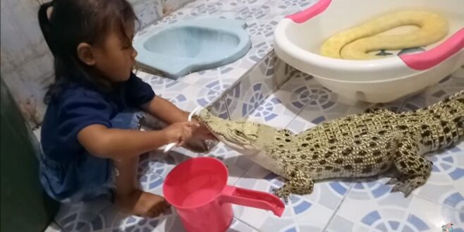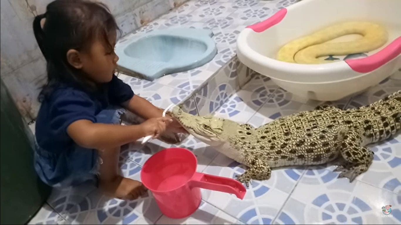 Elle a été filmée en Banten, Indonésie en train de brosser les dents d’un petit crocodile. Elle était si calme, elle n’avait pas du tout l’air peur.
