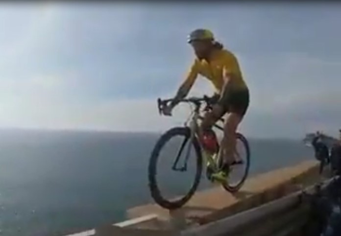 Muni de son casque, ce cycliste monte sur un rempart au-dessus d’une falaise avec son vélo. Il roule ensuite sur un espace d’une largeur d’une vingtaine de centimètres puis de quelques centimètres seulement à certains endroits.