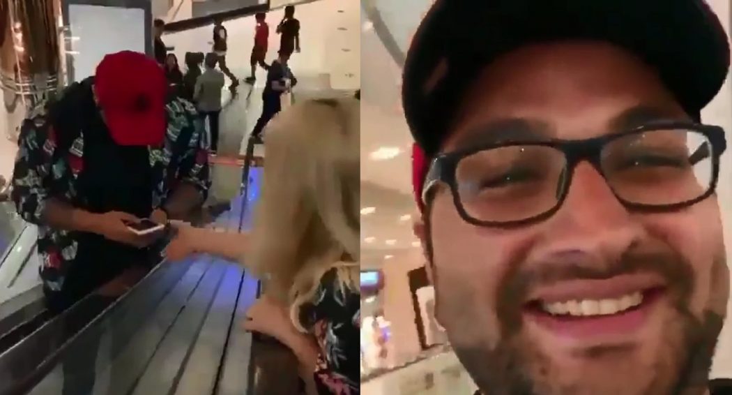 Les femmes descendaient dans l’escalier automatique et l’homme montait à côté d’elles. Une des deux femmes lui a pris son téléphone portable alors que l’autre filmait avec le sien. L’homme avait un réflexe rapide et a pris le téléphone de la femme qui le filmait.